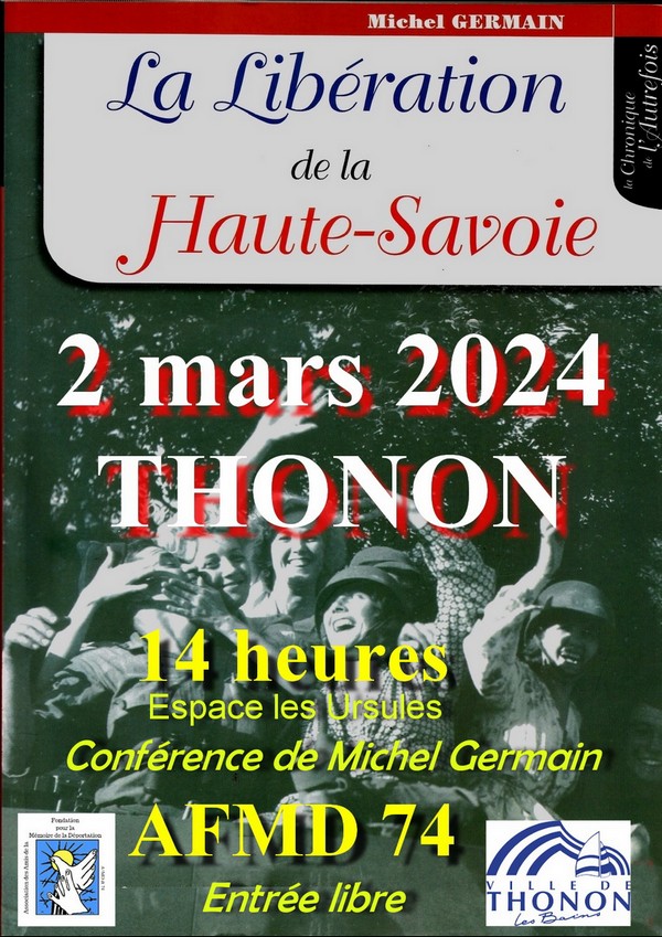 A Thonon, conférence sur la libération de la Haute Savoie le 2 mars prochain à 14h.